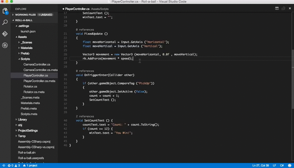 Visual Studio Code는 Unity에서 C# 파일을 편집하는 데 큰 도움이 될 수 있습니다. 모든 C# 기능이 지원되며 더 많은 기능이 있습니다. 아래 화면에서 코드 색상화, 괄호 매칭, 인텔리센스, 코드렌즈 등의 기능을 확인할 수 있습니다. 그리고 이것은 시작일 뿐입니다.