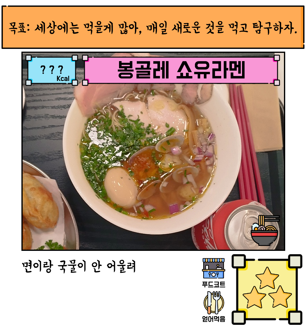 | [콘부] 봉골레 쇼유라멘 ★★★☆☆ (0) | 2023.07.15 |