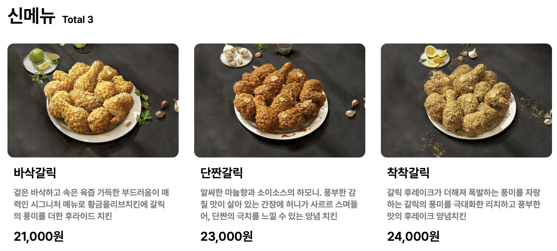 신메뉴: 바삭갈릭, 단짠갈릭, 착착갈릭